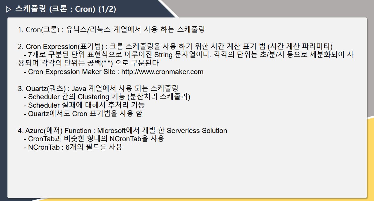 대부분 스케줄링이 필요 할 정도의 규모가 되면 자체 솔루션이 있더나 스케줄링 로직들은 이미 있는 경우가 많아서 뼈대를 새로만드는 경우는 거의 없다고 봐도 될듯 합니다.