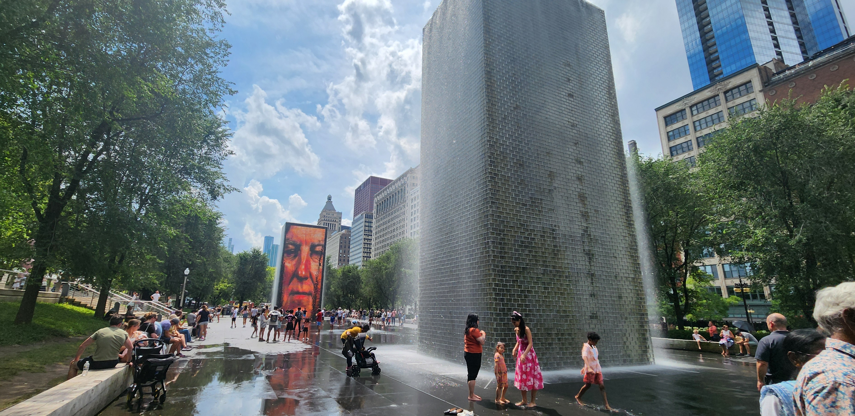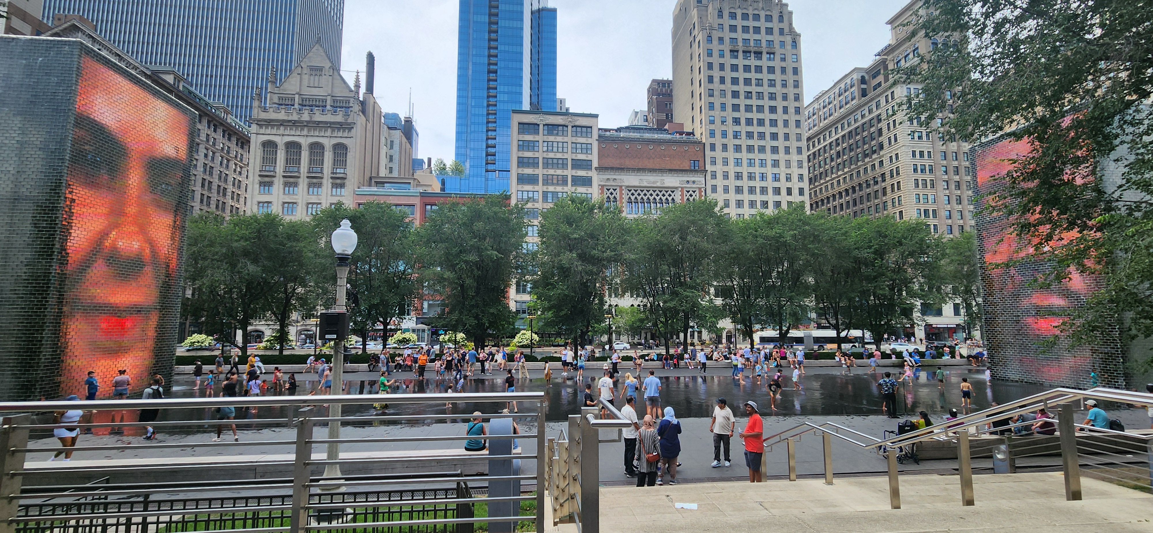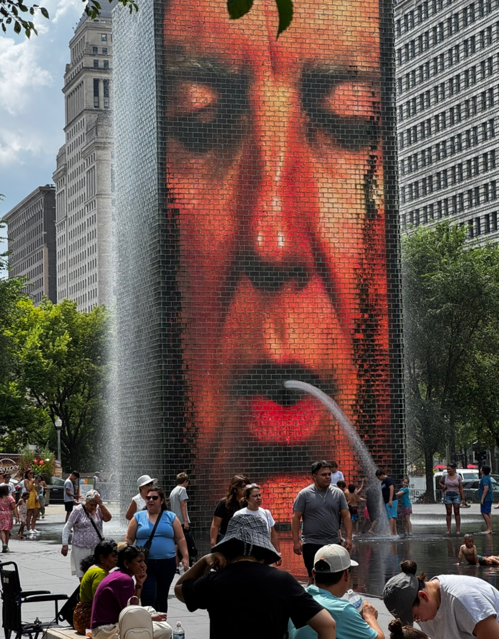 두 개의 15.2m 높이의 유리벽 타워로 구성되어 있으며, 각 타워는 LED 디스플레이를 통해 시카고 시민 1,000명의 얼굴 영상을 보여줍니다.