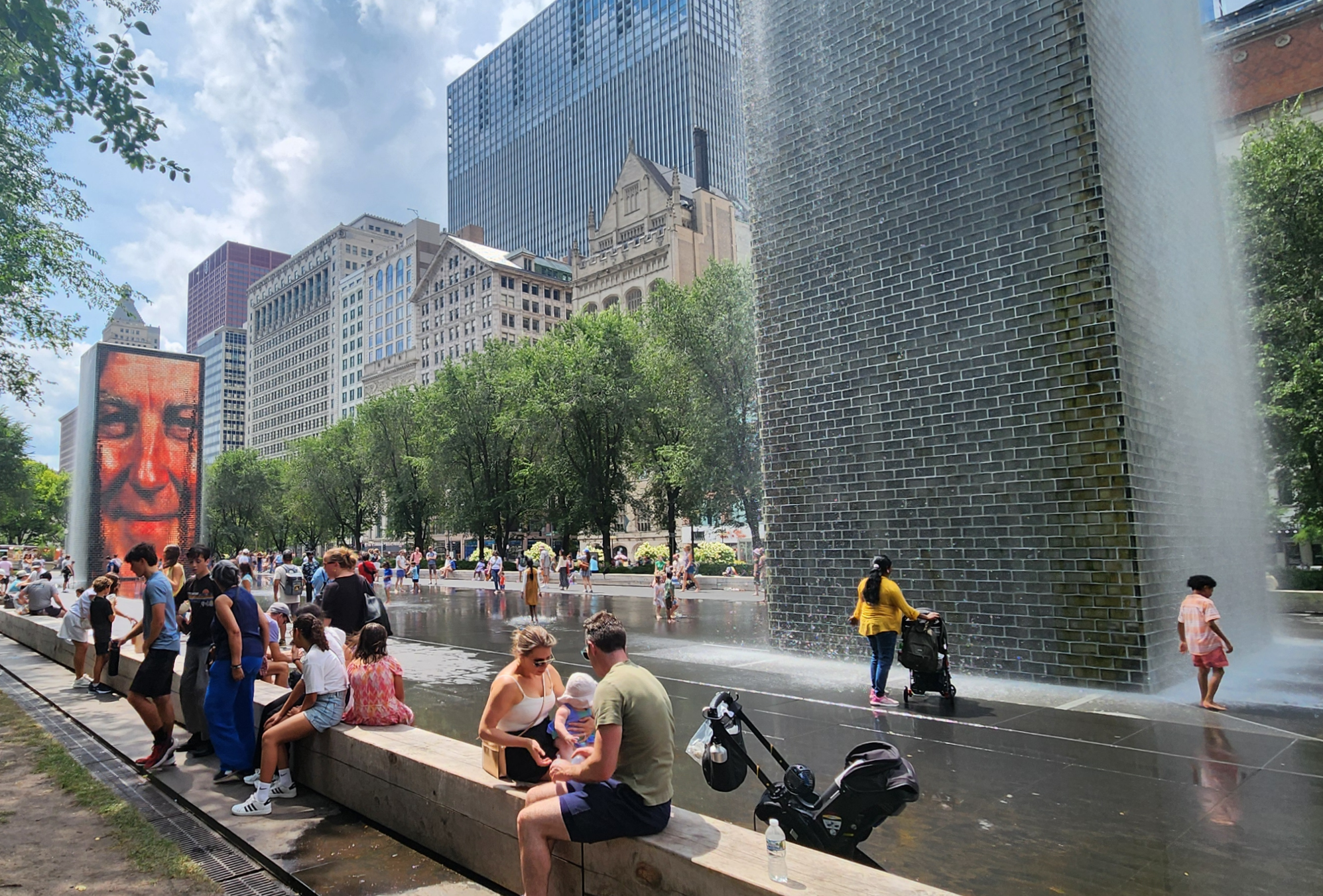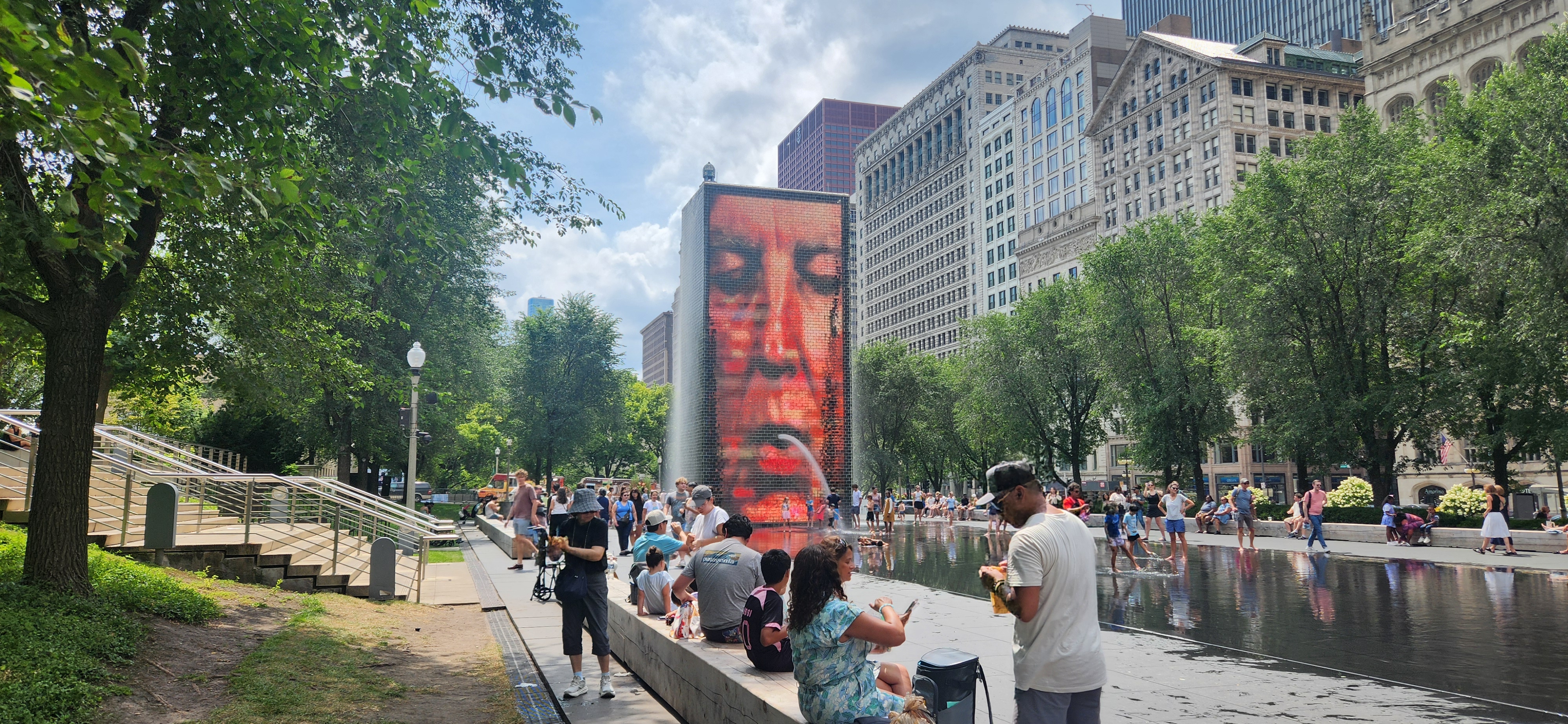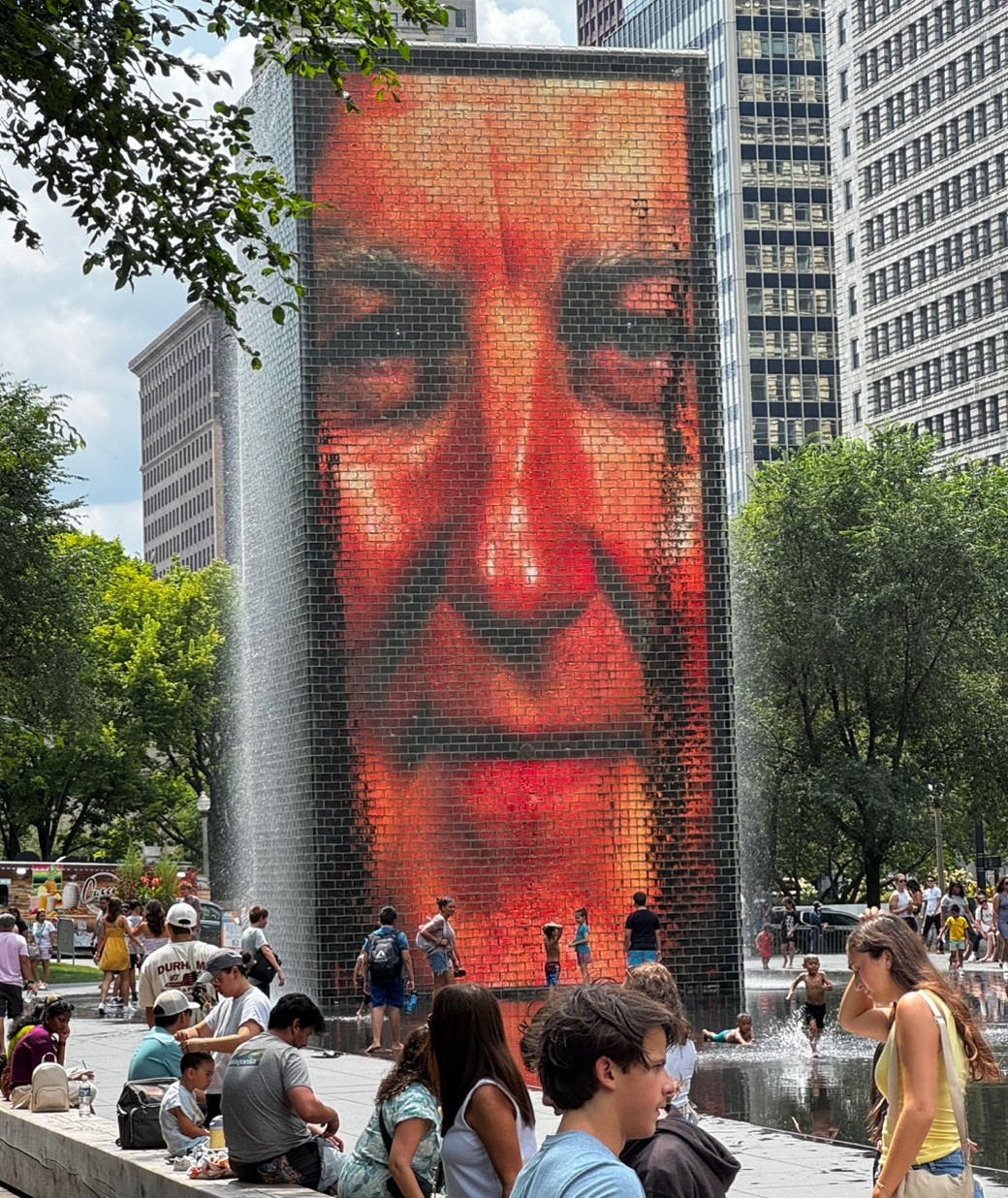 두 개의 15.2m 높이의 유리벽 타워로 구성되어 있으며, 각 타워는 LED 디스플레이를 통해 시카고 시민 1,000명의 얼굴 영상을 보여줍니다.
