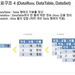 ======================================================안녕하세요 Doridori 입니다. 이번 강의는 DataRow, DataTable, DataSet에 대한 강의 입니다. 기본적으로 DataTable과 DataRow는 한묶음이라고 보시면 되고 DataSet의 경우 DataTable을 모아놓은 자료 구조라고 보시면 될것 같습니다. 여기까지 열심히 진행 하셨으면 이제 어느정도 원하는 형태의 Data는 다룰수 있다고 생각 합니다. ^^====================================================== 자료구조 4 (DataRow, DataTable, DataSet) Source UI) Soruce 전체) 교재) 이번강의는 DataRow..